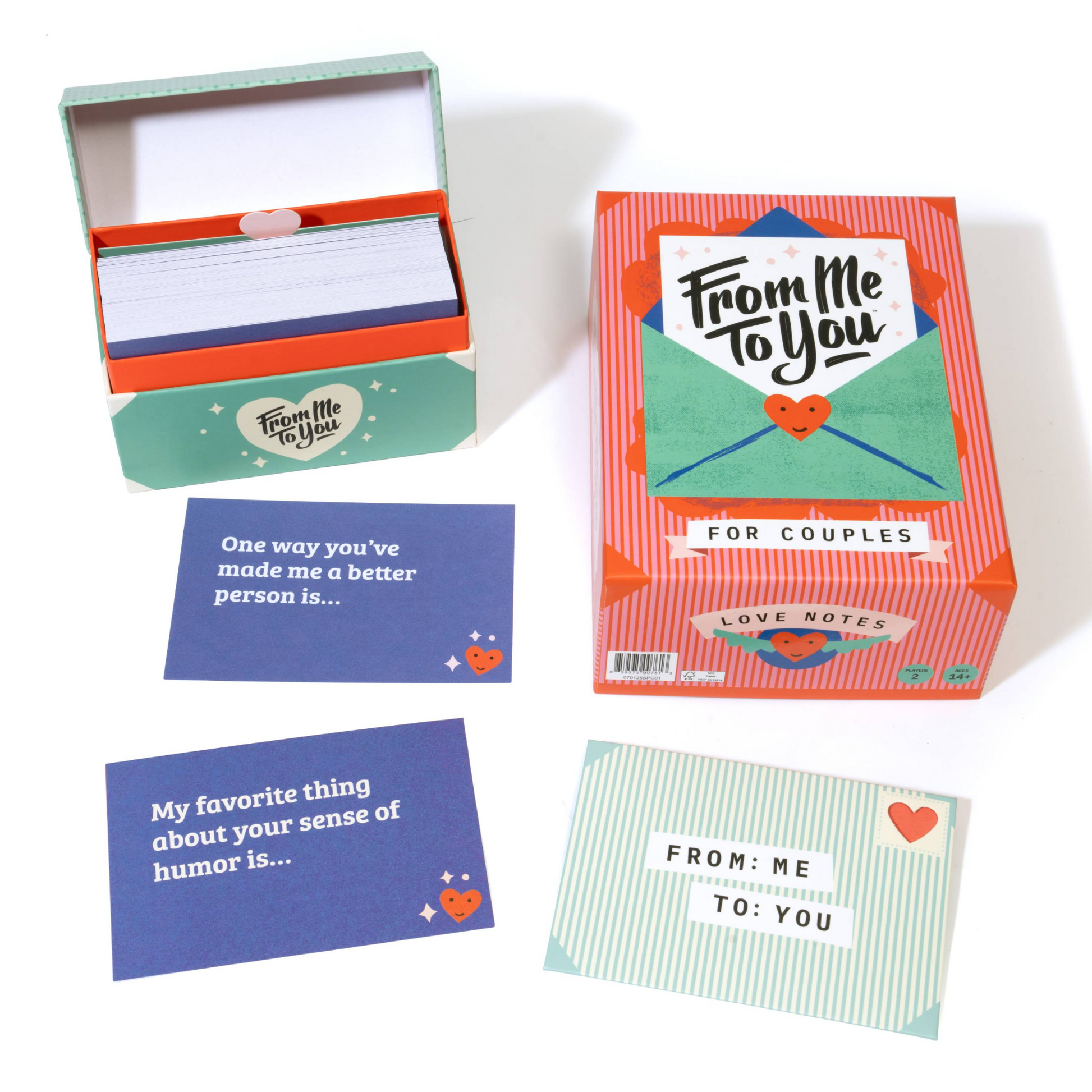 What’s Included: 100 prompt cards (with space on the back for your handwritten note), 1 reusable heart-window custom envelope, 1 rules sheet, and 1 small keepsake box, perfect for storing all of your completed notes. Designed for 2 players, ages 14+