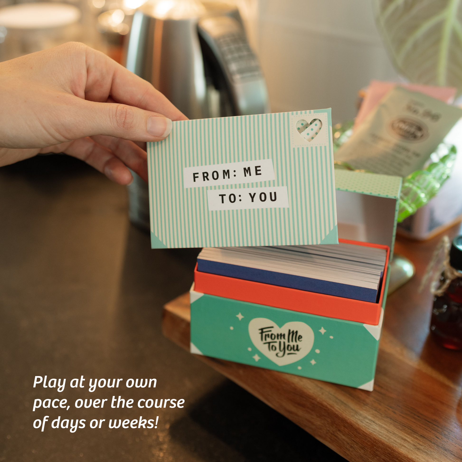 How It Works: Play over days or weeks, drawing a new card to prompt each note you’ll write. Once your partner finds your note, it’s their turn to write you a note back.