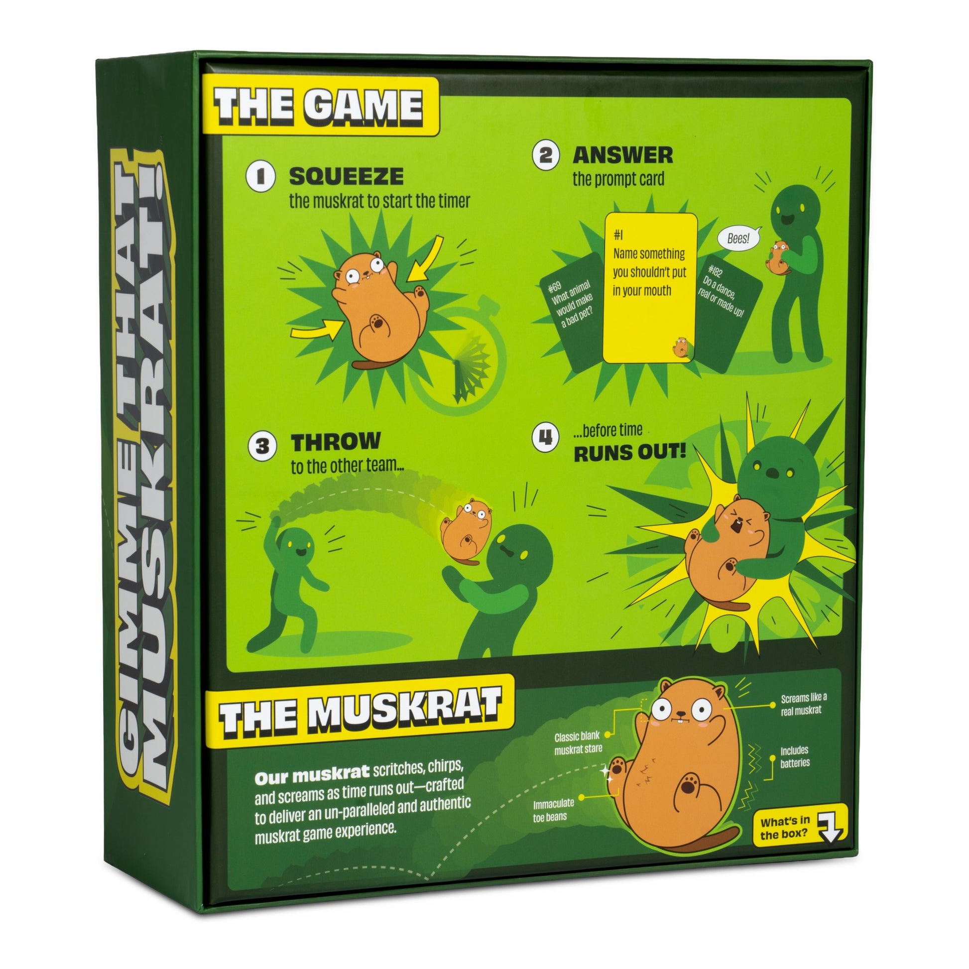 - Gimme That Muskrat: A rodent-tossing party game you never knew you needed…until now! Featuring an electronic Muskrat named Marvin, this new game is silly, ridiculous, and fun for ages 8 to 88+. This high-energy game combines the thrill of hot potato with fast-thinking prompts.