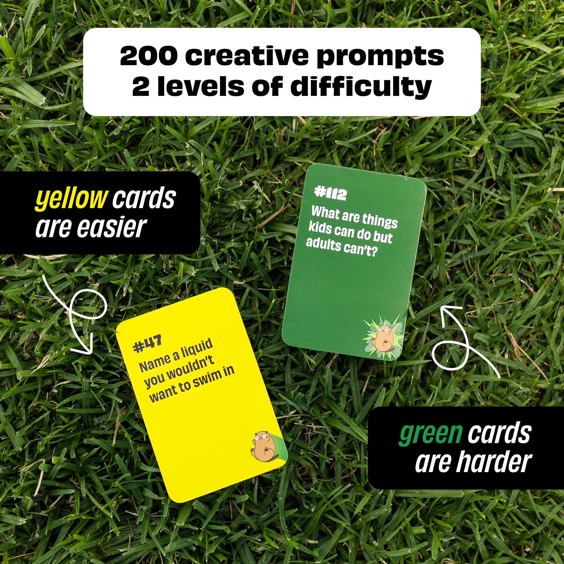 - Endless fun: Includes 1 screaming muskrat (batteries included) and 200 prompts (100 cards with 2 levels of difficulty)! Yellow cards are easier prompts for kids, and green cards are more challenging for older kids, teens and adults. With cards like “What animal would make a bad pet?”, “Name something you shouldn’t put in your mouth”, and dozens more, players are guaranteed laugh-out-loud answers.