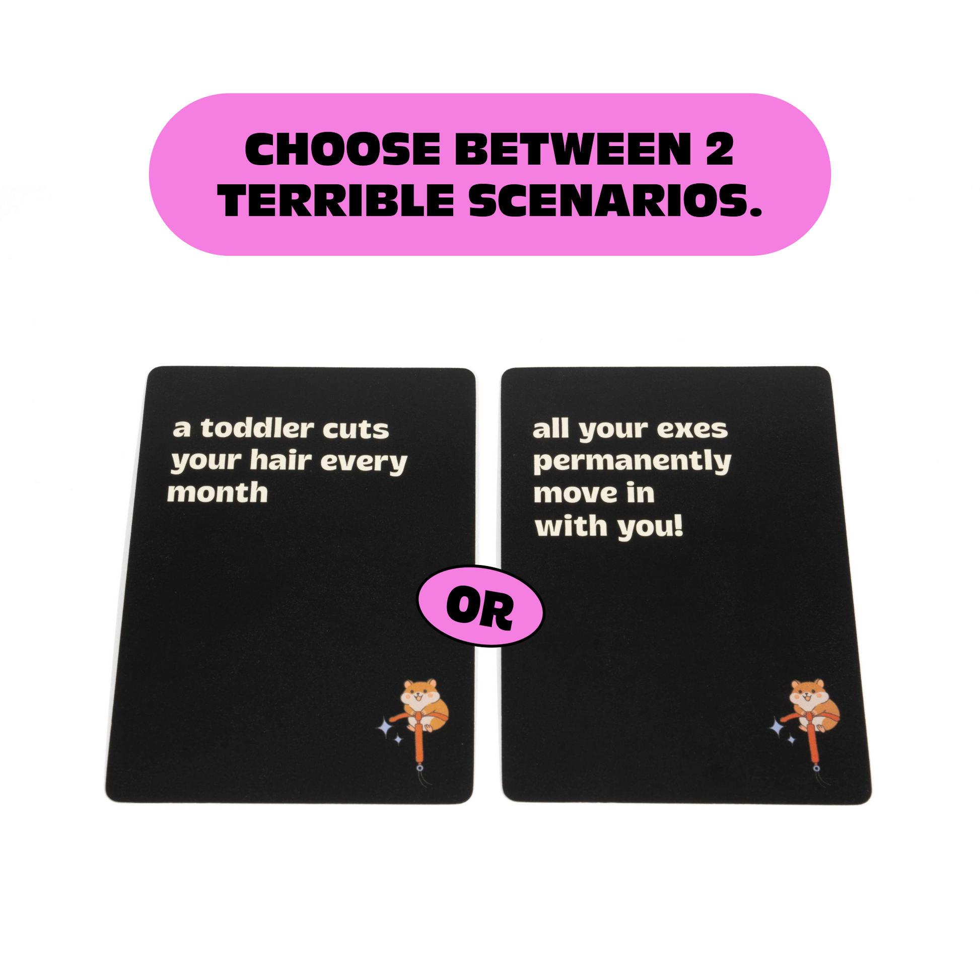 How to play: Split into 2 or more teams. The chillest person is the first judge. The judge draws a card for each team. Each team argues why their card is the worse option. The judge decides which card is worse. That team wins 1 point. First team to 3 points wins! The judge rotates to the left. Play again with new teams!